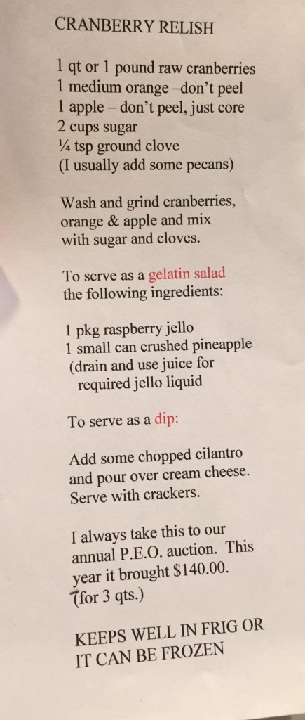 This is my favorite cranberry recipe. It’s from my brother-in-law’s grandma, LaVonn McKnight. LaVonn was such a sweet lady, and a wonderful cook. She was one of those people that you felt comfortable telling your life story. My little niece, Vonn is named after her. This is the recipe she typed up and sent to my sister.