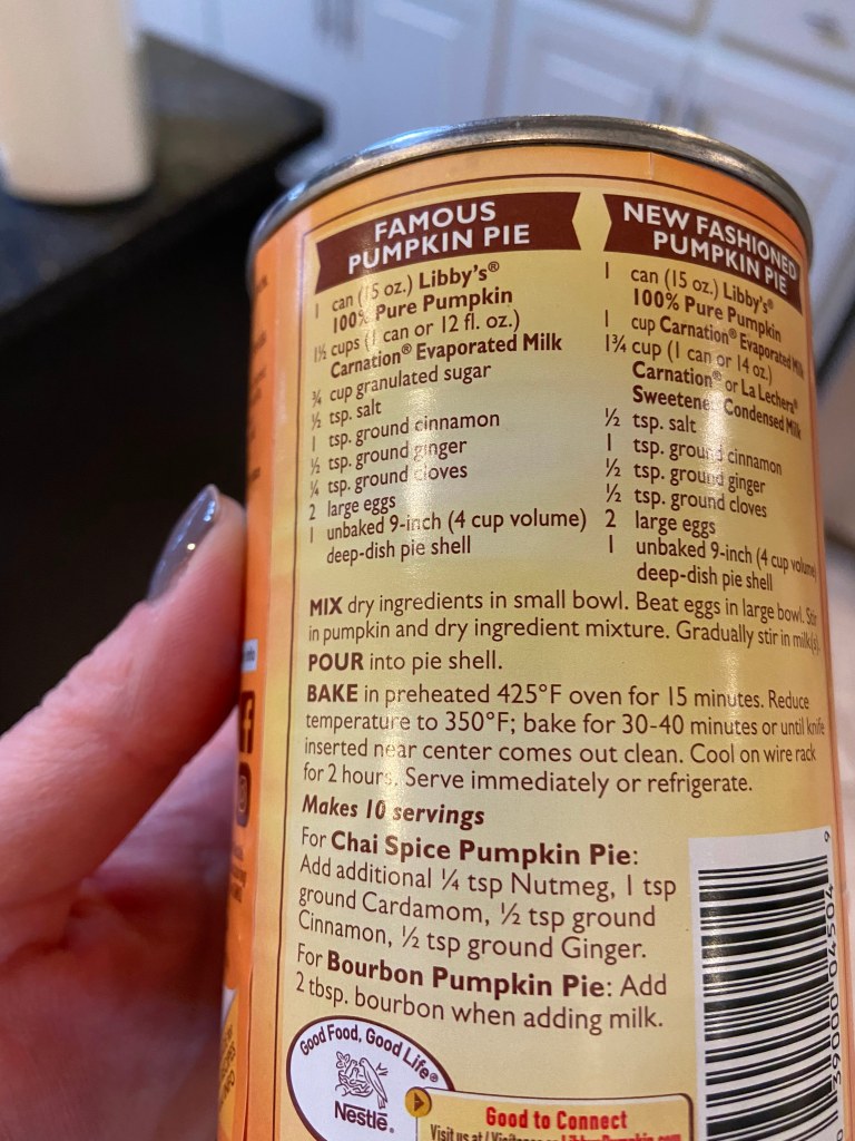 Here’s the recipe, straight from the back of the can. Ignore the nonsense about “new fashioning” your pie or adding chai spice. That’s too weird. Stick with what works.